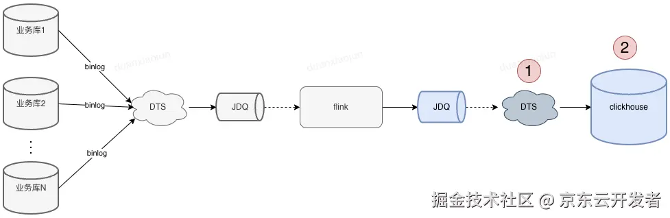 结合供应链的使用场景,这里在flink层加工完数据后没有直接将数据写入ClickHouse集群,而是发送到JDQ队列中。这样做的优势 1、加工和存储解藕 2、JDQ消息共享;