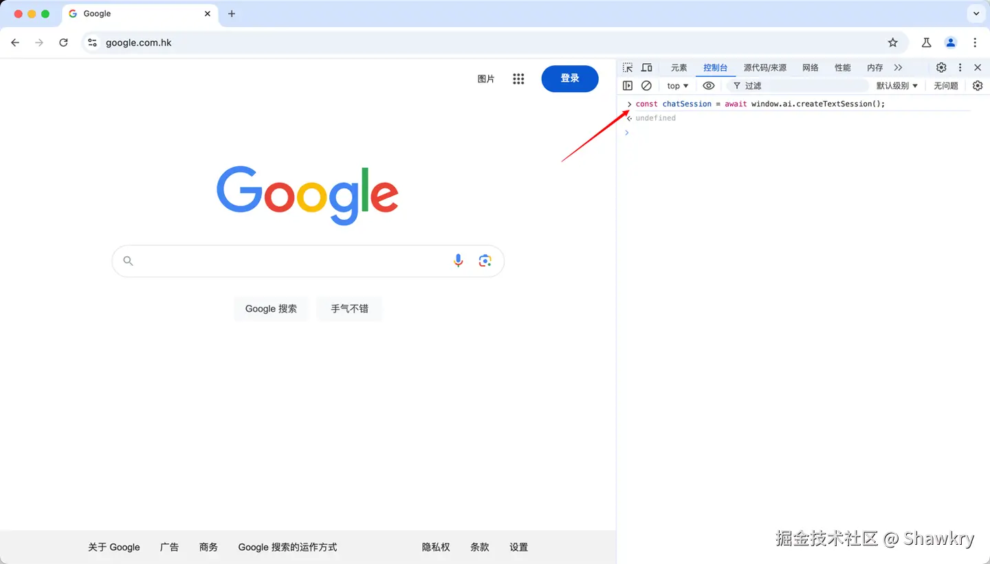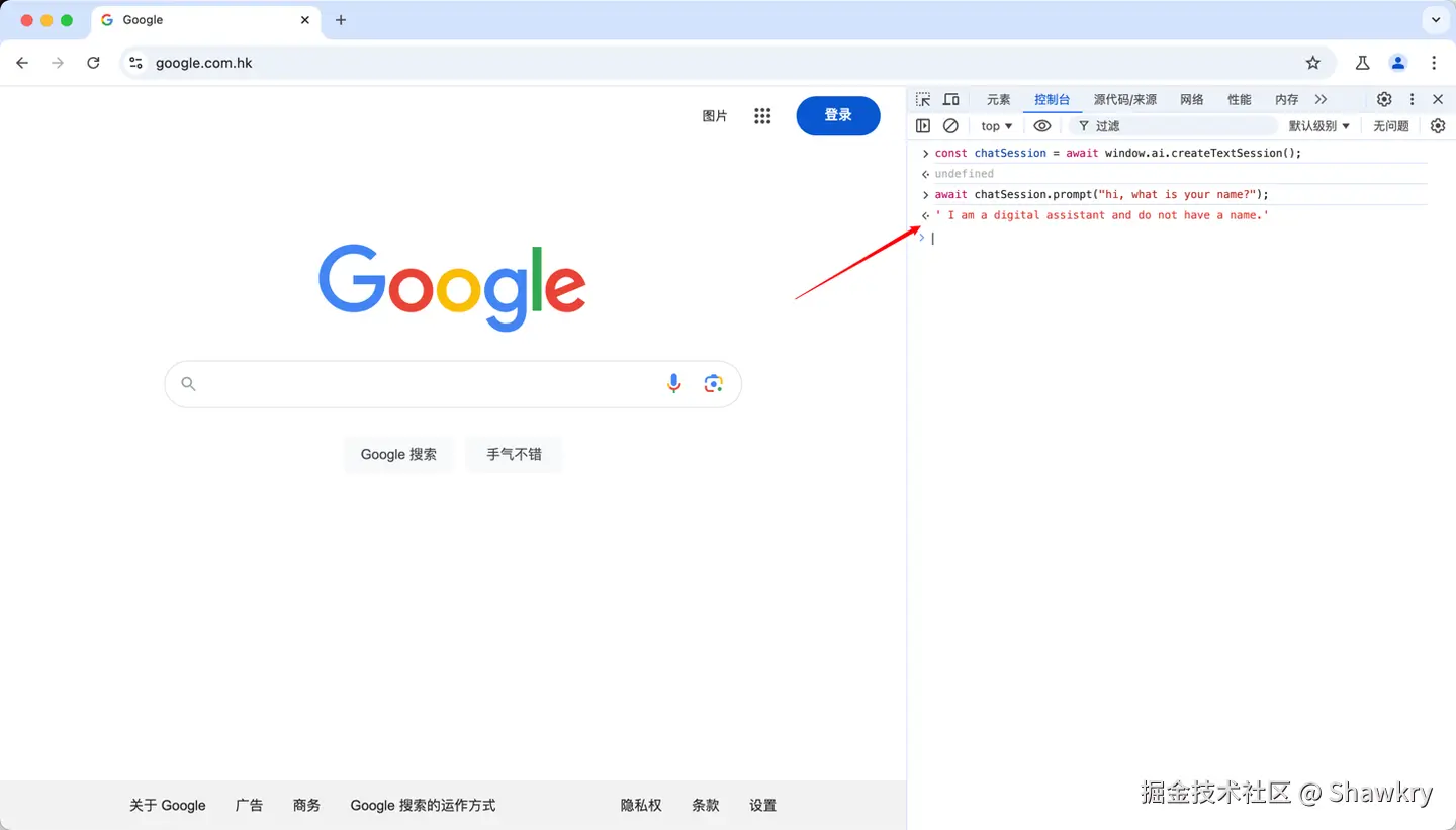 如果完成上述所有的准备工作,我们就可以开始在控制台使用window.ai了。现在让我们使用 F12 打开 Chrome Canary 的控制台。