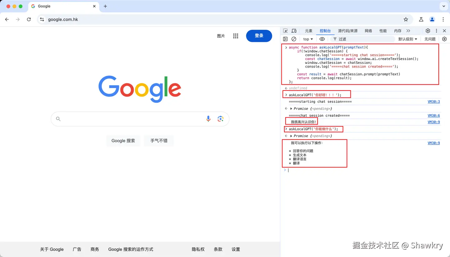 继续在控制台输入以下命令之后,就能和 Gemini Nano 正常对话了: