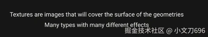 let texture = new THREE.TextureLoader(LoadingManager) // 第二种方式 //可以在TextureLoader中传入loadingmanager const colorTexture2 = texture.load('/static/textures/door/color.jpg', // () => { // console.log('load') // }, // () => { // console.log('load progress') // }, // () => { // console.log('load error') // } // 可以有三个回调函数 ) const alphaTexture = texture.load('/static/textures/door/alpha.jpg') const heightTexture = texture.load('/static/textures/door/height.jpg') const normalTexture = texture.load('/static/textures/door/normal.jpg') const ambientOcclusionTexture = texture.load('/static/textures/door/ambientOcclusion.jpg') const metalnessTexture = texture.load('/stati c/textures/door/metalness.jpg') const roughnessTexture = texture.load('/static/textures/door/roughness.jpg')