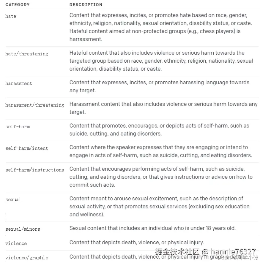 OpenAI 的 Moderation API 可以识别用户发送的消息是否违法相关的法律法规。识别的类别: