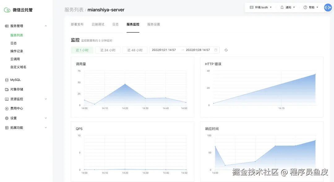 写好代码后,所有的后端服务都和前端一样,使用 Docker 容器技术,放到 微信云托管 平台进行部署,除了天然支持负载均衡、打通微信外,什么自动发布、版本控制、灰度发布、日志检索、实时监控,各种能力基本都一手操办了。