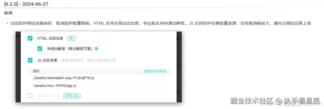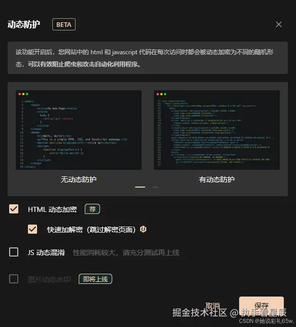 - 动态加密:对网页前端代码进行动态加密,防止恶意爬虫和漏洞扫描行为。