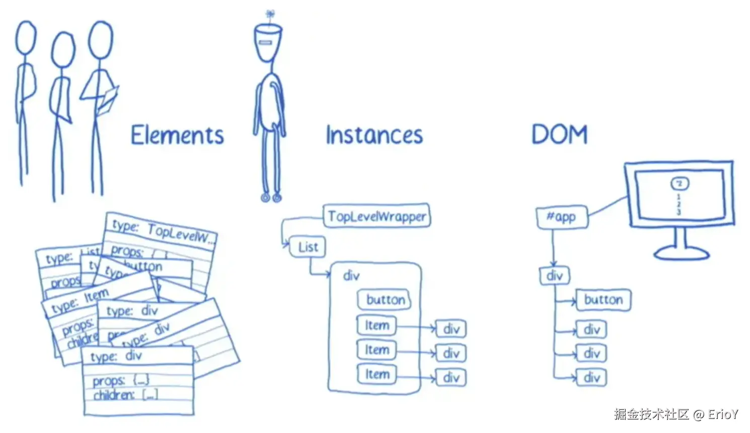 - Elements:表示 JSX 代码,描述 UI 长什么样子,这些会被创建成 element 对象的形式,保存了 type、props、children 等信息