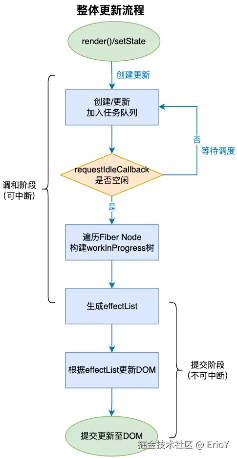 总的来说,Fiber分为两个阶段,一个是可中断的调和阶段,一个是不可中断的提交阶段