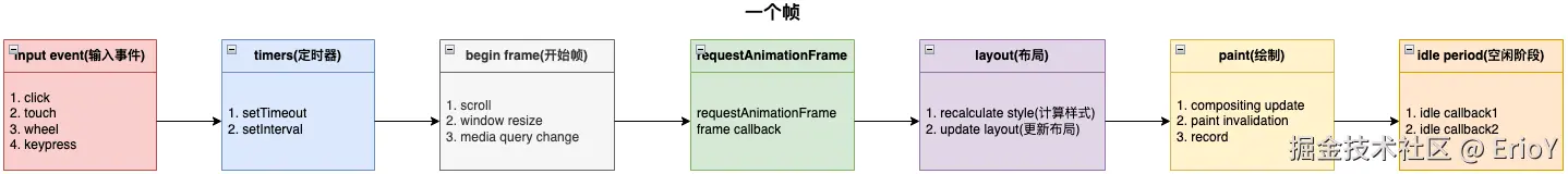 到这时以上的六个阶段都已经完成了,接下来处于空闲阶段,可以在这时执行 requestIdleCallback 里注册的任务