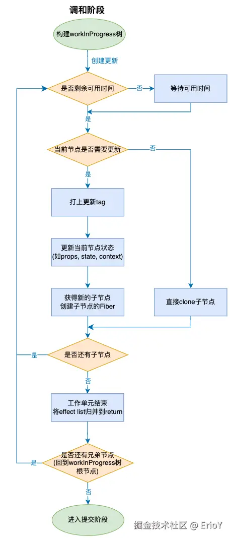 调和阶段以 Fiber 树为基础,把每个 Fiber 作为一个工作单元,自顶向下逐节点构造 workInProgress 树
