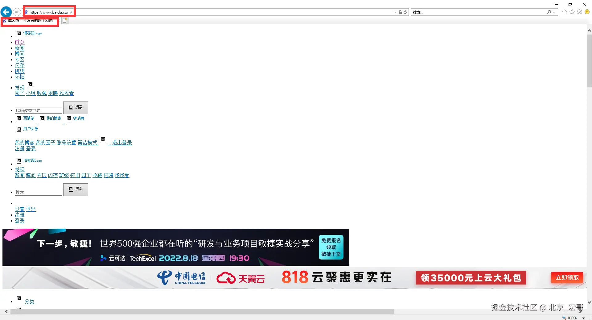 3.浏览器访问百度,发现网址是www.baidu.com,但是浏览器访问的却是博客园首页,如下图所示: