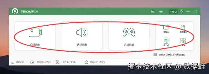 步骤1:下载并安装数据 蛙录屏软件,然后在桌面打开软件后,选择需要的录制模式,如视频录制、游戏录制、摄像头录制等。