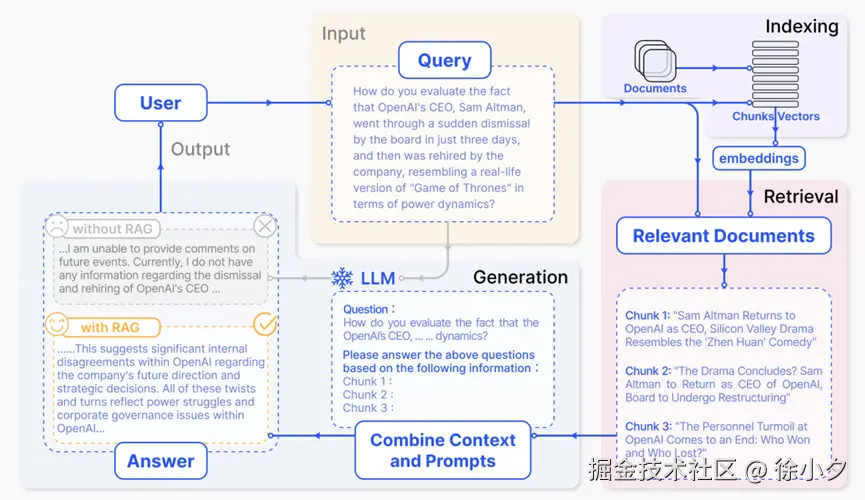 - 数据新鲜度问题:LLM 预训练完成后,不能感知实时更新的数据。RAG 可以将实时更新的公域数据或企业内部私域数据进行处理后,提供给 LLM,使其能够生成基于最新信息的回答。
