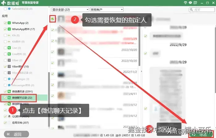 第3步:完成扫描这一步之后,就可以在左侧的导航栏中预览 【微信聊天记录】 ,最后在右侧预览界面中选择你想要恢复的指定联系人的聊天记录,再点击 【导出】 就完成啦!整个过程快速又高效,快来码住这个宝藏软件吧!