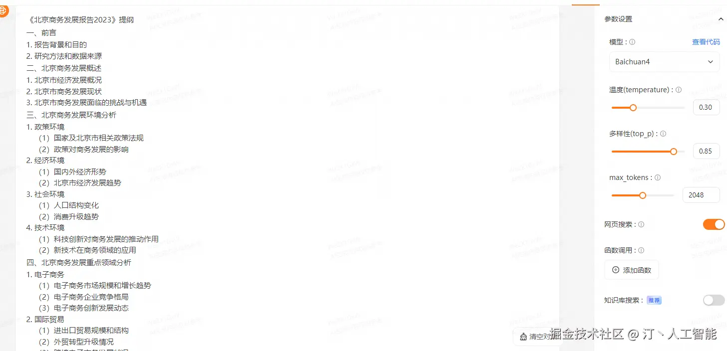 AIMessage(content='《北京商务发展报告2023》提纲\n\n一、引言\n 1. 报告背景\n 2. 报告目的与意义\n 3. 数据来源与研究方法\n\n二、北京市商务发展概况\n 1. 北京市经济发展总体情况\n 2. 北京市商务发展主要指标分析\n 3. 北京市商务发展特点与趋势\n\n三、北京市重点行业商务发展分析\n 1. 金融业\n 1.1 北京市金融业发展现状\n 1.2 北京市金融业发展特点与趋势\n 1.3 北京市金融业发展前景展望\n 2. 高新技术产业\n 2.1 北京市高新技术产业发展现状\n 2.2 北京市高新技术产业发展特点与趋势\n 2.3 北京市高新技术产业发展前景展望\n 3. 现代物流业\n 3.1 北京市现代物流业发展现状\n 3.2 北京市现代物流业发展特点与趋势\n 3.3 北京市现代物流业发展前景展望\n 4. 其他重点行业(如旅游业、文化创意产业等)\n\n四、北京市商务发展政策环境分析\n 1. 北京市商务发展政策环境概述\n 2. 北京市商务发展政策环境对行业发展的影响分析\n 3. 北京市商务发展政策环境展望\n\n五、北京市商务发展区域布局分析\n 1. 北京市商务发展区域布局现状\n 2. 北京市商务发展区域布局特点与趋势\n 3. 北京市商务发展区域布局展望\n\n六、北京市商务发展面临的挑战与机遇\n 1. 北京市商务发展面临的挑战\n 2. 北京市商务发展面临的机遇\n 3. 北京市商务发展应对挑战与把握机遇的策略建议\n\n七、北京市商务发展展望\n 1. 北京市商务发展总体展望\n 2. 北京市重点行业商务发展展望\n 3. 北京市商务发展政策环境与区域布局展望\n\n八、结论\n 1. 北京市商务发展主要成果与经验总结\n 2. 对北京市商务发展的建议与展望\n\n九、附录\n 1. 北京市商务发展相关数据汇总\n 2. 北京市商务发展相关政策汇总\n 3. 北京市商务发展相关研究报告与文献汇总', response_metadata={'token_usage': {'prompt_tokens': 21, 'completion_tokens': 475, 'total_tokens': 496}, 'model': 'Baichuan2-Turbo-192K'}, id='run-071ed1da-6950-412a-9a60-7216ceb53af0-0')