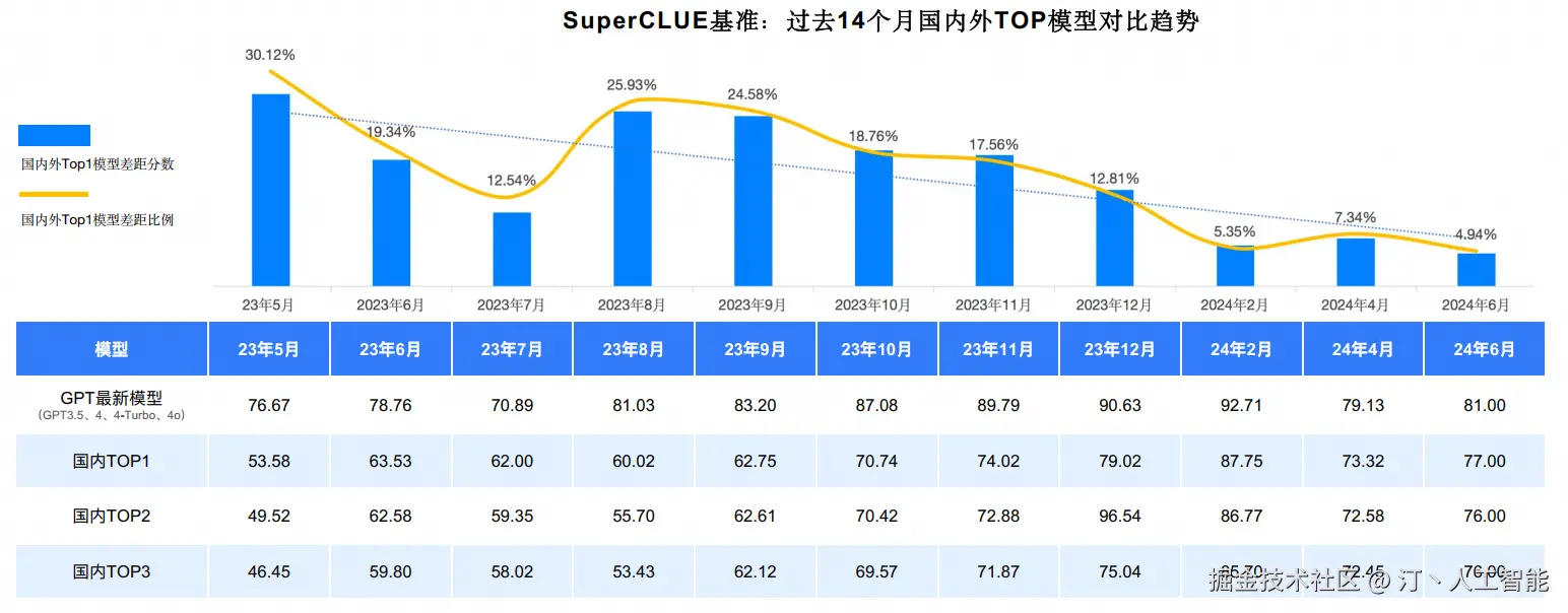 从宏观趋势来看,国内外顶尖大模型在中文处理能力上的差距正显著缩小。这一变化尤为引人注目,从2023年5月时高达30.12%的差距,到2024年6月已缩减至仅4.94%,标志着国内外大模型在中文通用能力上正逐步走向并驾齐驱的新阶段。这一成就不仅反映了中国AI技术的快速崛起,也预示着全球AI领域更加紧密的竞争与合作格局正在形成。