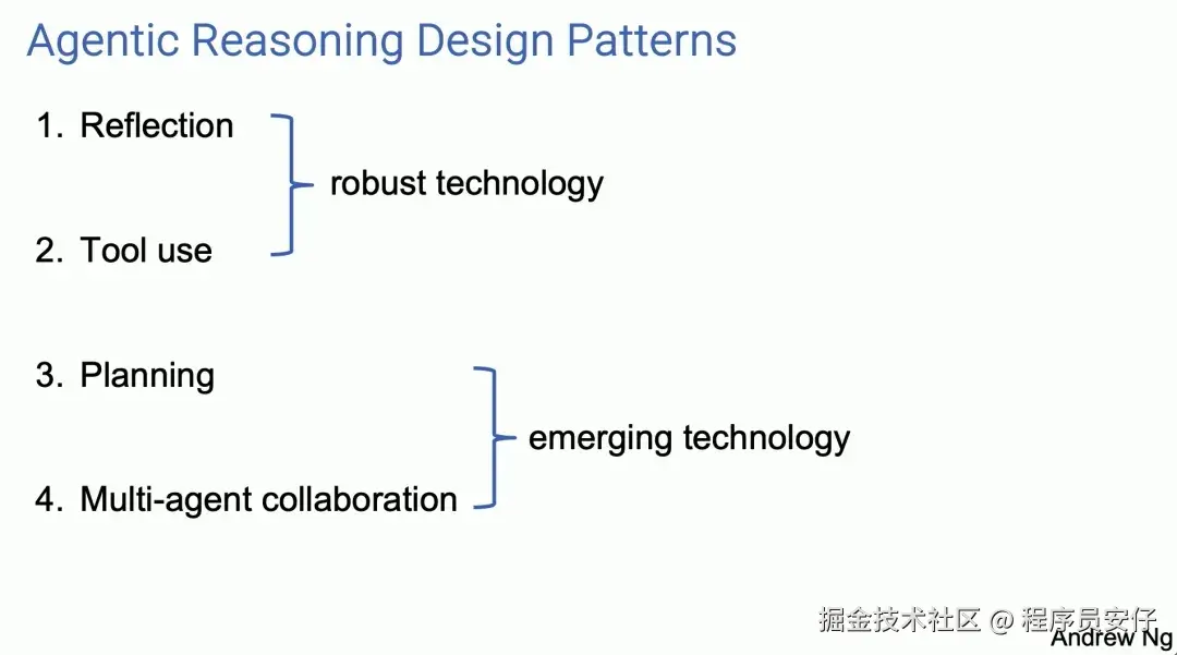 如果你了解过吴恩达教授之前总结出来的 AI Agent 四种设计模式的话,你会发现这个项目其实是一个典型的“反思优化(Reflection)”模式。也就是说,通过对初始结果的反思和优化,可以让 AI 模型不断提升自身的能力,实现更高质量的翻译,这里顺便列出一下吴恩达总结的四种设计模式: