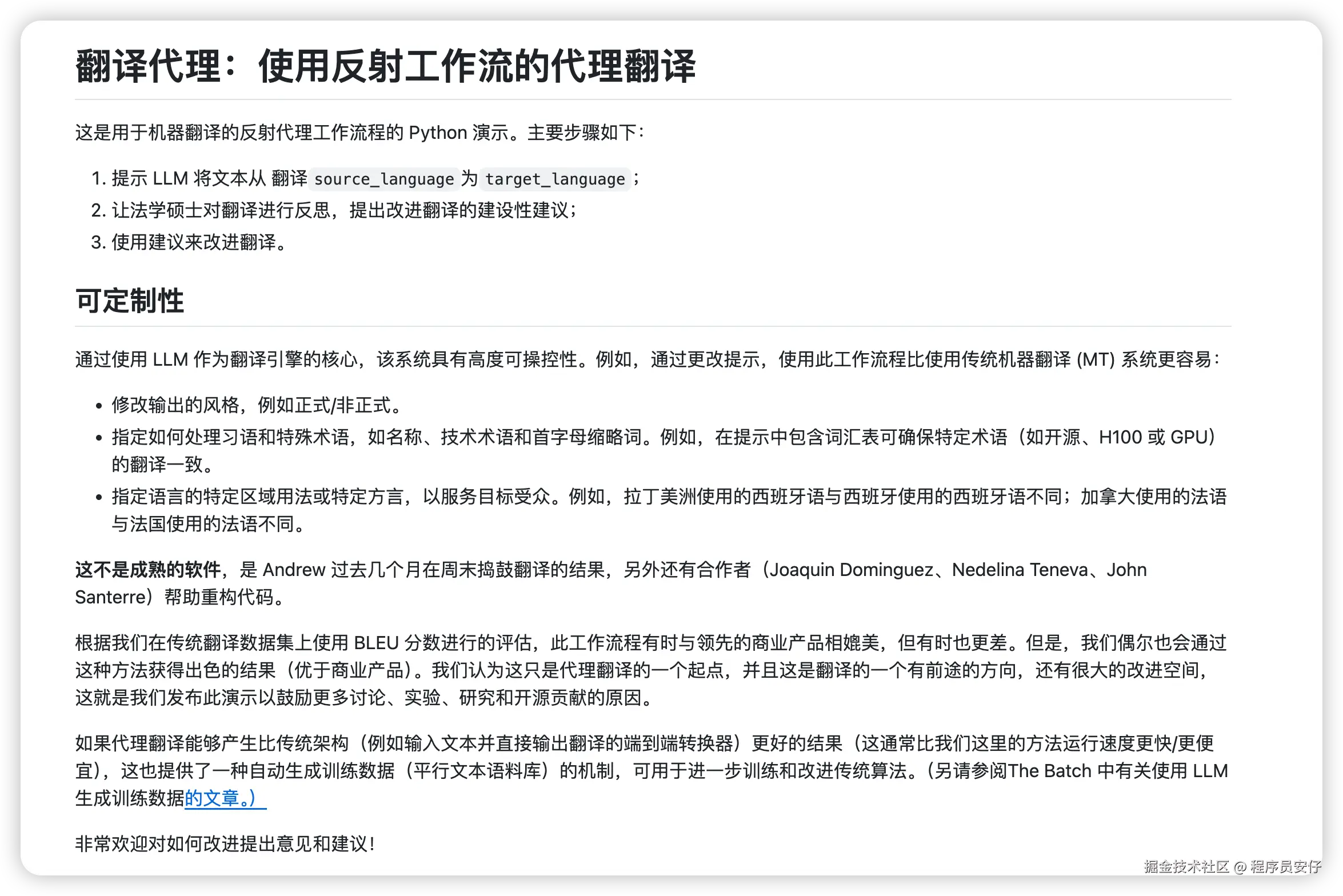 最近,AI 界的大神吴恩达就开源了一个基于 AI 原理的翻译项目,项目地址是 github.com/andrewyng/t… 。这个项目虽然是纯代码实现,但是其背后的设计原理非常值得我们借鉴。最关键的是,通过该项目所采用的反思优化机制,可以显著提升 AI 翻译的质量,效果非常惊艳!