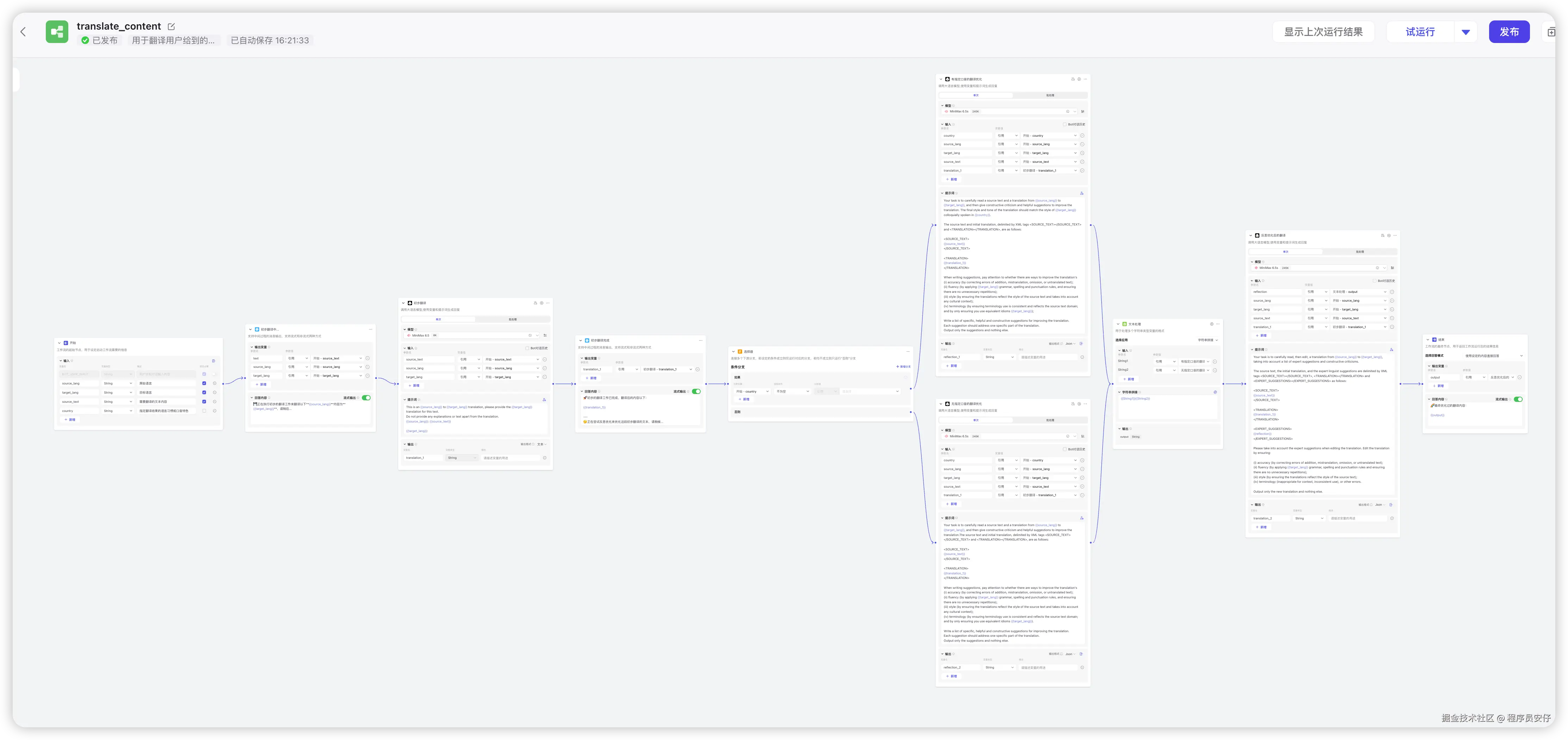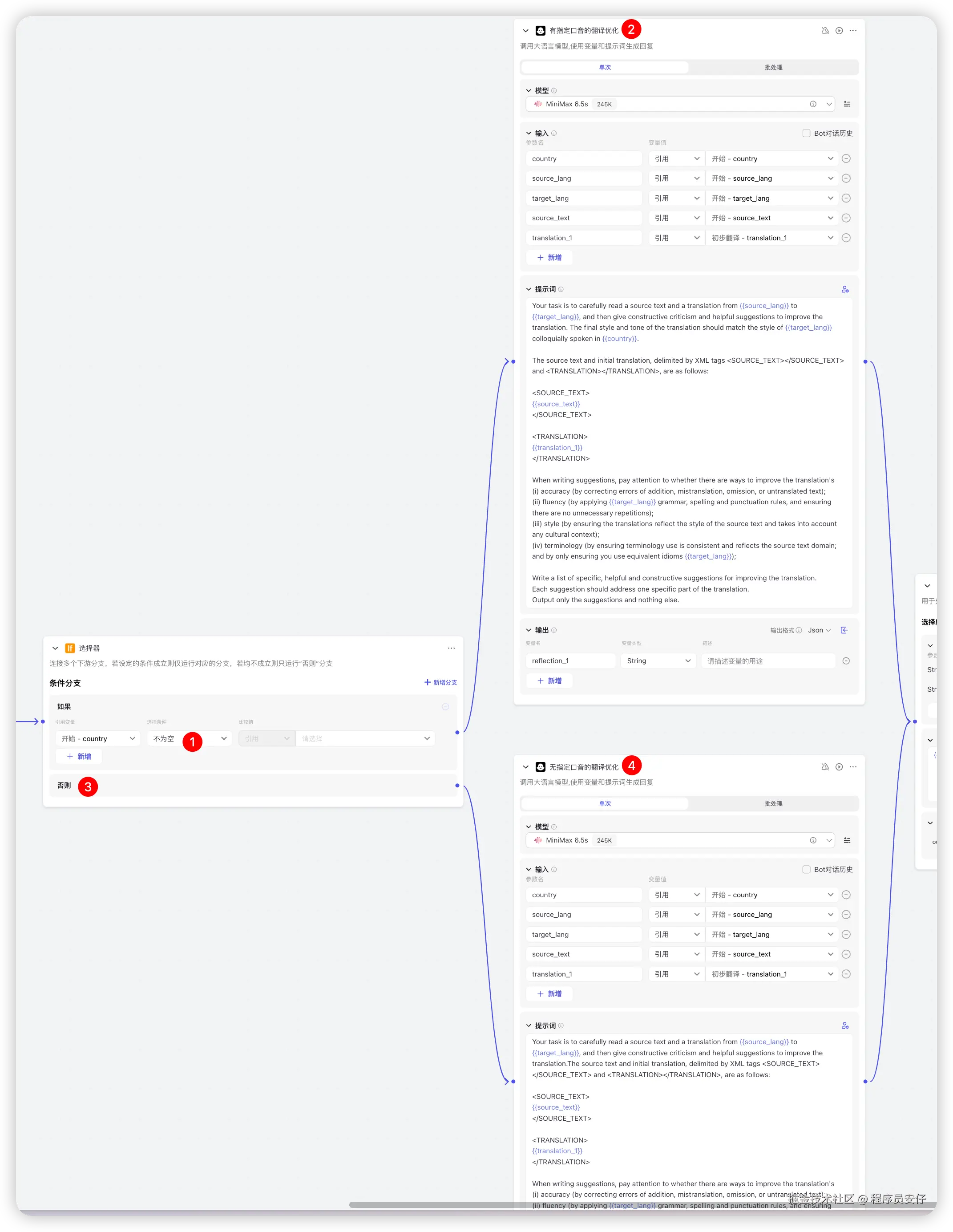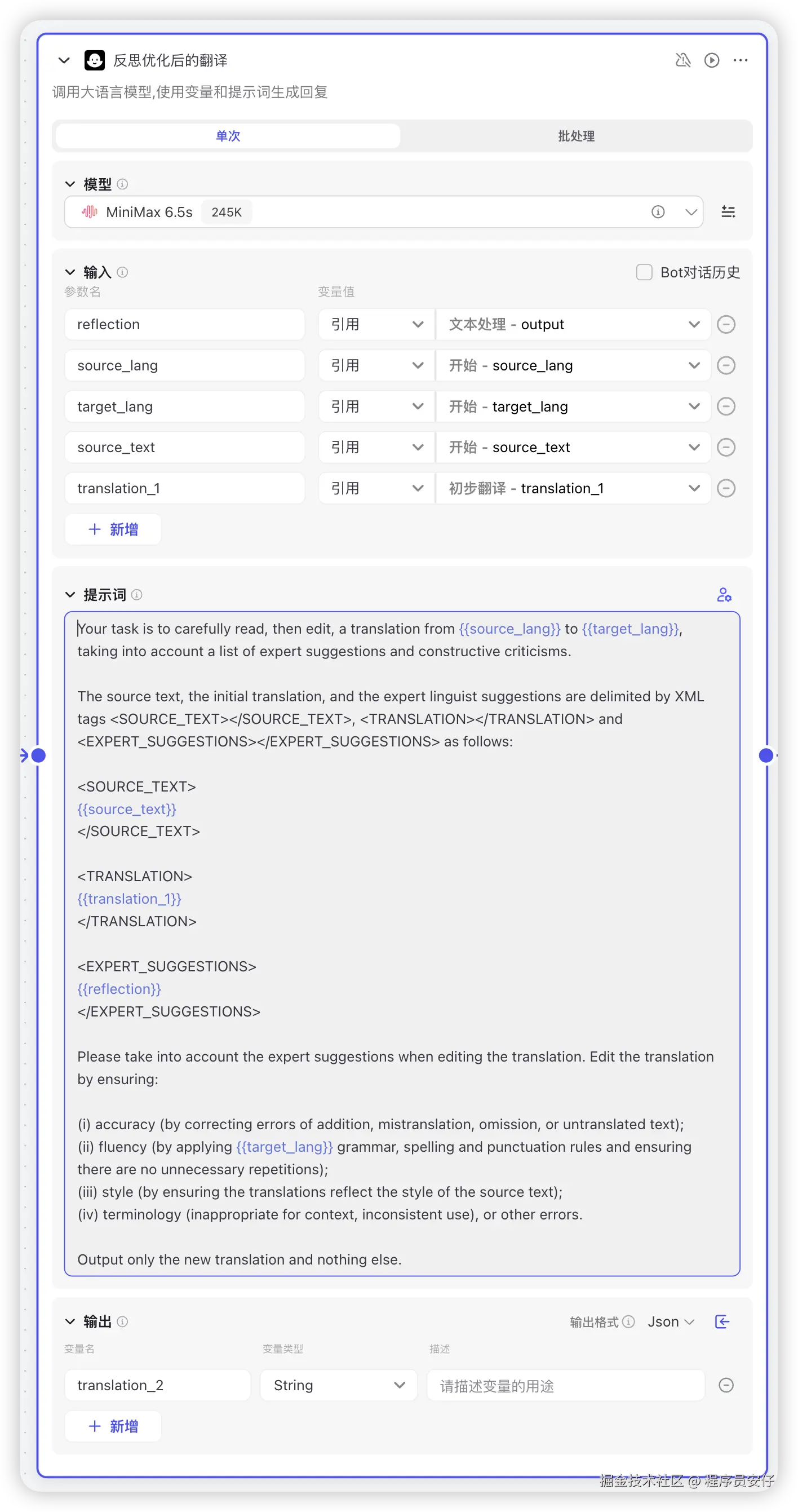 大模型节点了,这里其实就是结合上述的反思优化的建议,再结合初始翻译的结果再次进行翻译,以此获得更好的翻译结果,如下图: