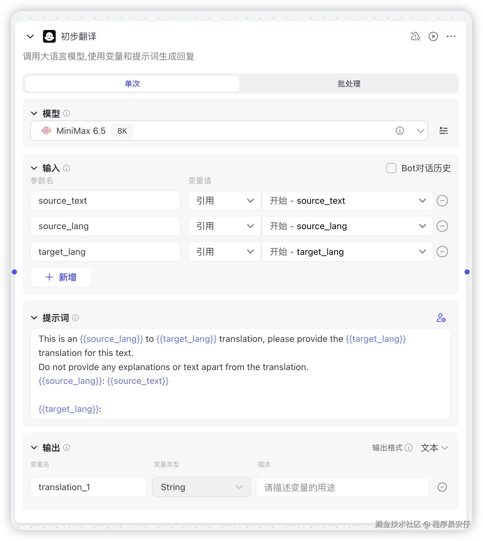 当然,这里还有个功能是还没有复刻的,那就是分块处理,这个功能其实也是非常重要的,因为对于长文本的翻译,分块处理可以提高处理效率,更重要的是可以让模型在局部文本上进行更精细的优化,翻译质量可以进一步提升。这个进阶的功能,我就留到下次再和大家分享了,或者等你们熟悉了 Coze 平台后,自己去尝试实现也是可以的。