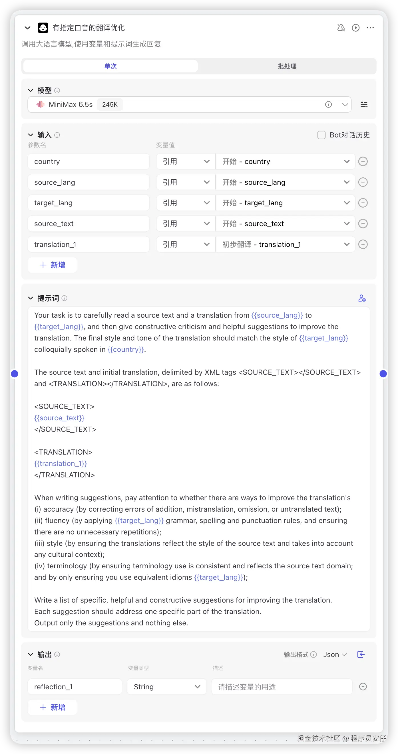 大模型节点,这里我们需要选择一个大模型,来对源语言文本进行初始翻译,这样才好对比并且以此作为进一步的反思优化。Coze 平台提供了多种 AI 大模型选择,这里我直接选了MiniMax,然后提示词我们就直接参考吴恩达教授的相关内容即可。