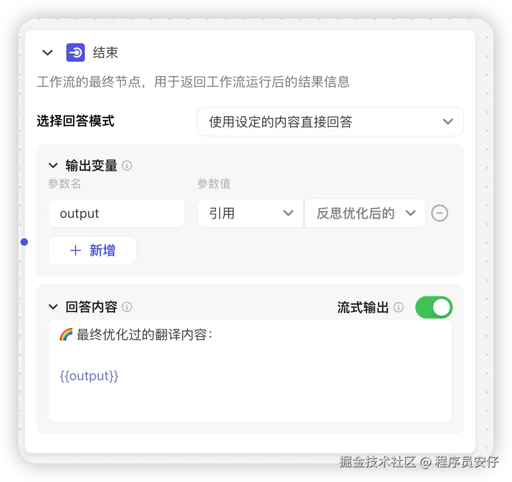 结束节点了,这里我们可以选择输出的方式了,这里我选择了自定义的内容输出 + 流式传输来输出翻译后的结果,如下图: