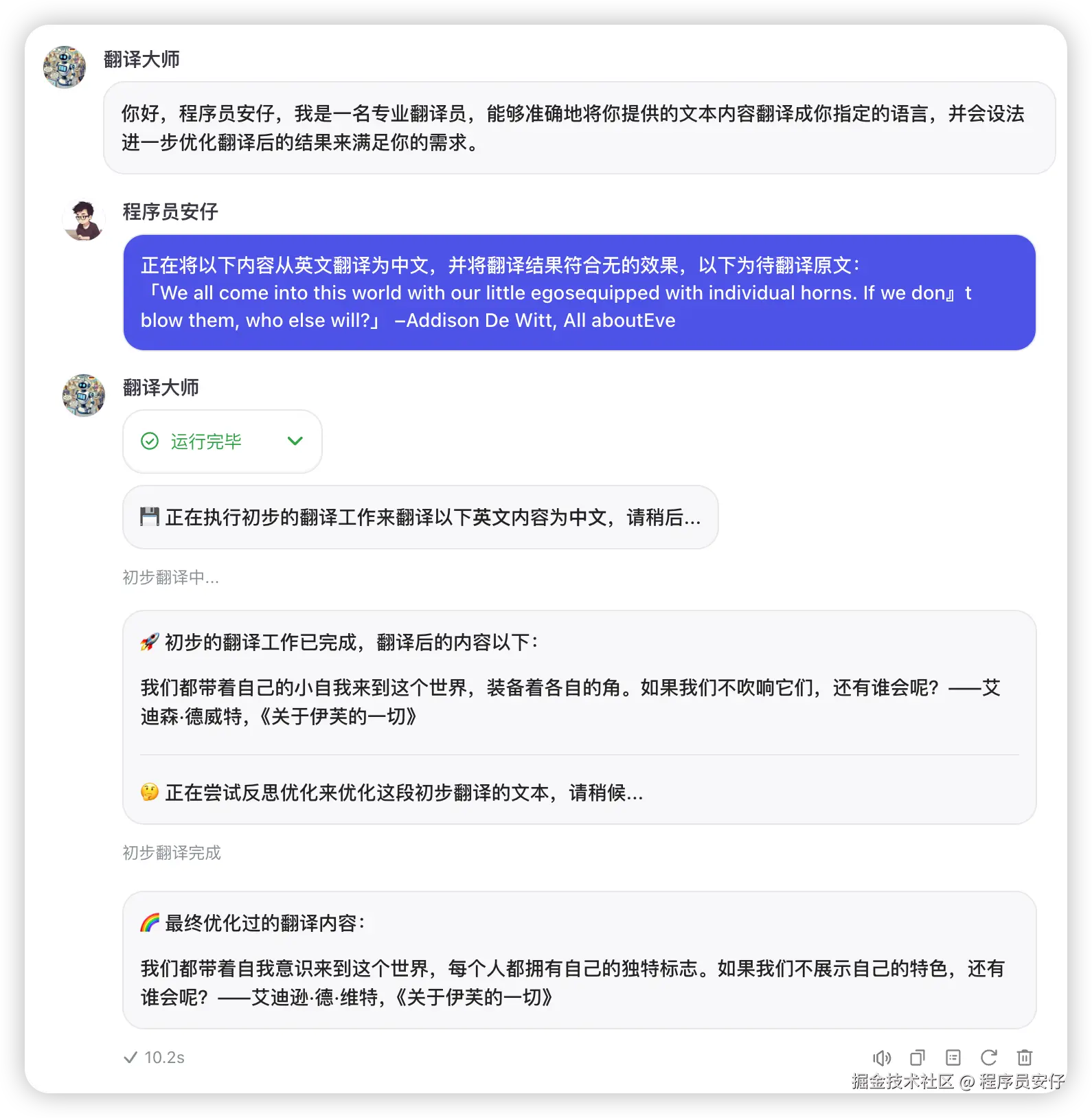 最后一步,对初始结果进行优化。我们再次调用 AI 模型,针对前一步识别出的可优化点,对初始翻译进行修修补补,润色打磨,让翻译变得更加流畅、准确、地道!