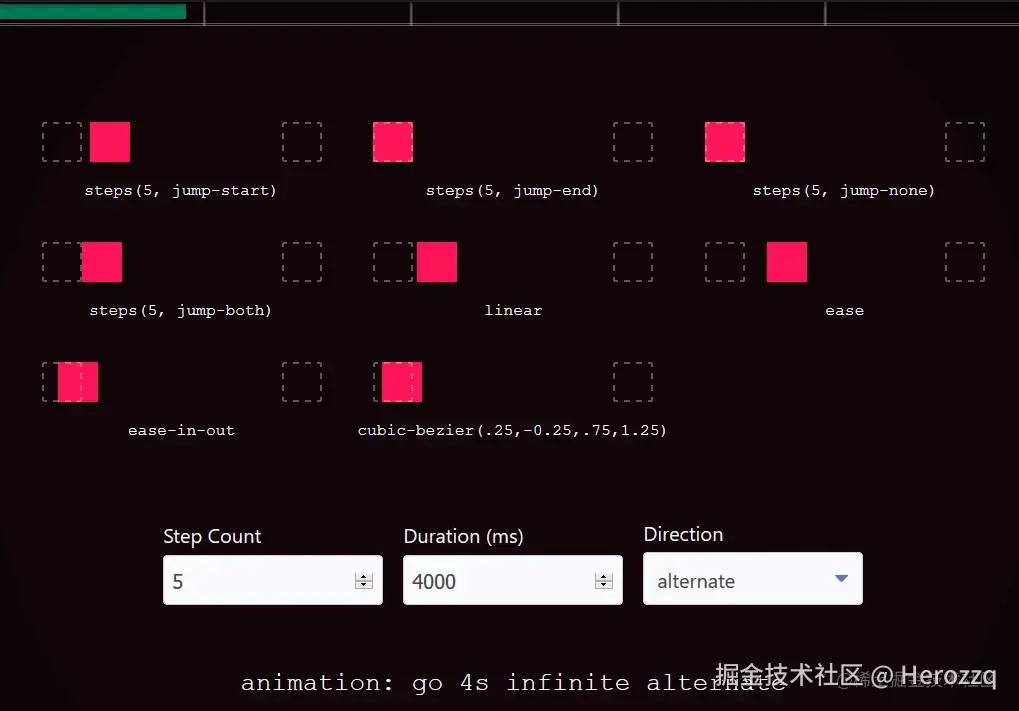 如下图所示step不同于其它连续流畅的缓动函数,它是顿挫执行的。