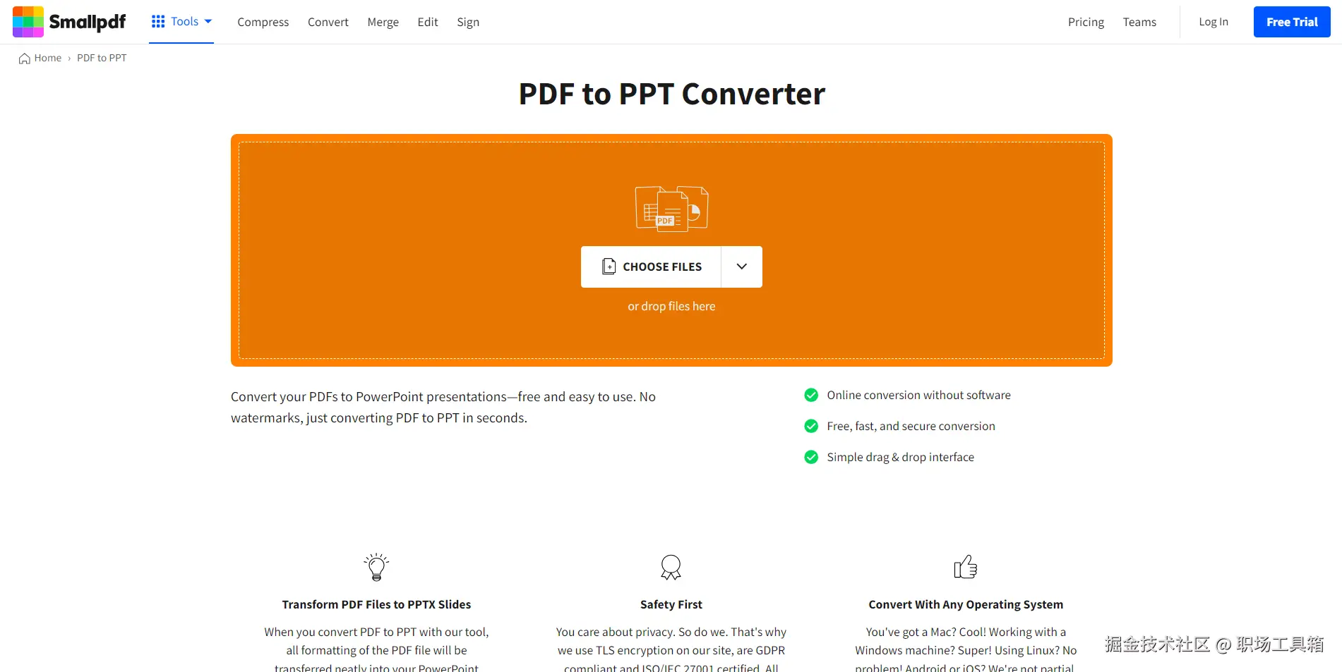 SmallPDF 集成了多款格式转换工具,从导航栏选择我们想使用的 PDF to PPT Converter,如下图所示,点击 CHOOSE FILES 上传本地的 PDF 文件,就能快速将 PDF 转换为 PPT 格式。