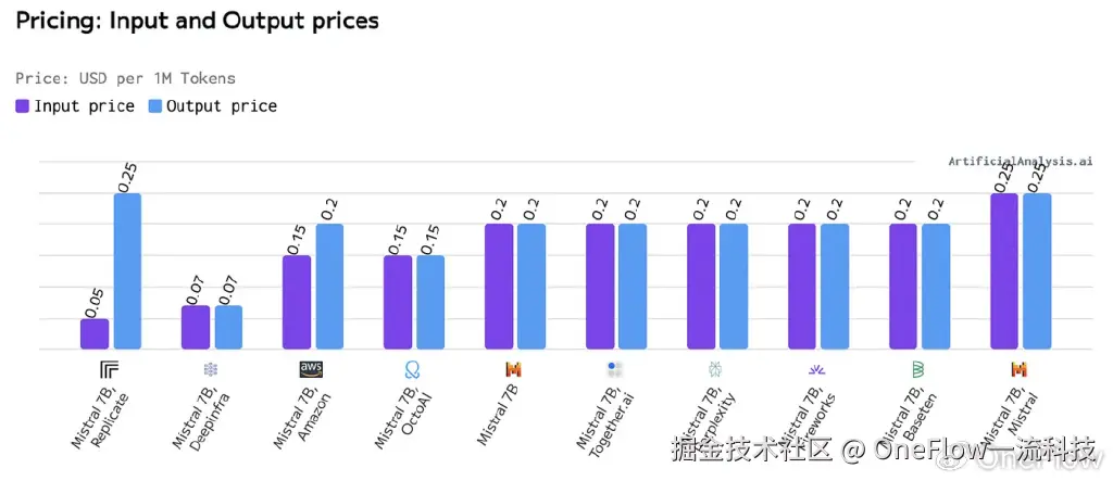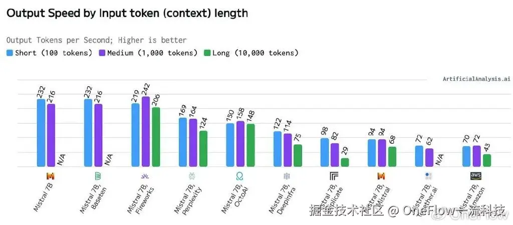 为说明这种商品化现象,我用Artificial Analysis (2024年7月6日提取的数据)来衡量不同推理平台的相对性能。我使用了当时广受欢迎的Mistral 7B模型,该模型在发布时是一个强大的不到十亿参数的语言大模型(尽管现在已被Meta的Llama 3 8B超越)。为简洁起见,我将只强调词元生成吞吐量的比较(Artificial Analysis有更全面的基准测试)。在这里,我们看到性能数据呈现出“聚集”现象(首先是Mistral/Baseten/Fireworks,其次是Perplexity/OctoAI,然后是其他所有平台)。需要特别指出的是,尽管大多数平台对于流媒体等用例已经足够,但对于函数调用等用例,其中输入和输出的长度可能很长,这就需要进一步的讨论和考量。