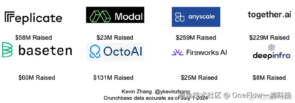 鉴于上述技术十分繁杂,许多初创公司应运而生,他们致力于化繁为简,帮助客户更快地在其产品中集成AI功能(部分相关公司已在下方列出)。我将重点讨论那些专注于推理功能的初创公司,而非提供全套服务(包括推理、训练和微调)的公司。