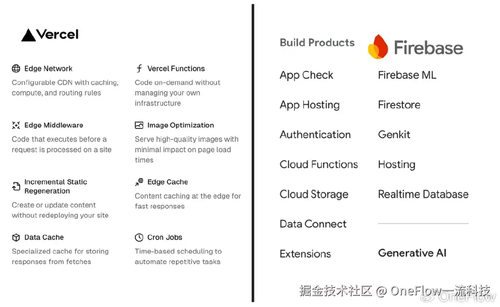 后端抽象化:我认为,真正的竞争来自于Vercel和Render等PaaS公司(以及云超大规模公司的自有平台,如Google Firebase)。这些平台已经为客户提供了部署现代Web应用所需的基本后端原语(函数即服务、数据库、缓存、身份验证、基本监控和可观察性等)。因此,这些服务扩展到生成性AI是非常合理的,而且实际上已经在实践了——Vercel通过其AI SDK提供AI服务,Google Firebase则通过Vertex AI提供AI服务。我认为,市场动态在这里变成了一场竞赛——是现有的PaaS最终主导AI工作流,还是AI推理公司能够将抽象技术作为突破口,扩展到计算领域? 企业不太可能会为需要的组件选择不同的供应商(PaaS、AI推理公司、向量数据库公司等)。