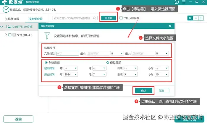 步骤3: 进入扫描结果的页面后,用户可以依据自己的偏好选择如何查找目标文件。左边栏目将扫描出来的文件分为【按类型查看】和【按路径查看】,如果想要更快地找到目标文件,但不太清楚具体的详细信息时,可以选择【筛选器】功能。筛选器可以缩小你要搜寻的范围,文件大小、文件的丢失时间等范围可以自由界定,更快更精准地找到目标文件。