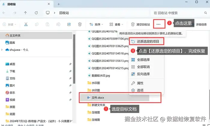 步骤2: 也可以选中误删文件后,点击【清空回收站】右边的三个小点,选择【还原选定的项目】 ,也能够达到同样的效果。