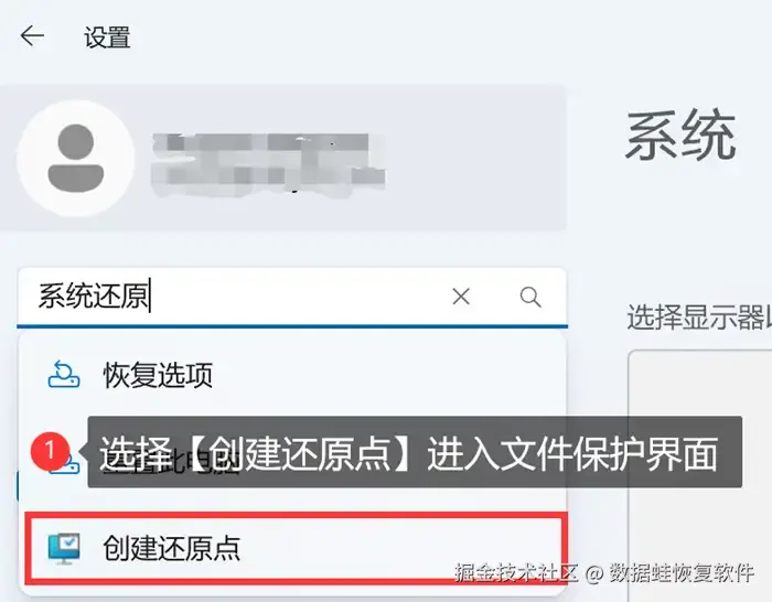 步骤1: 打开电脑的【设置】,如果找不到文件保护页面的话,可以直接在搜索框内搜索【系统还原】,点击相关结果的【创建还原点】。