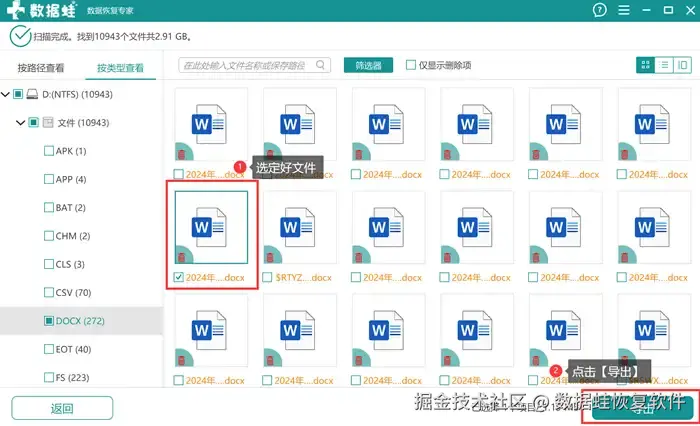 步骤4: 选定目标文件后,可以点击右下方的【导出】 ,选择【导出】后会弹出【浏览文件夹】的提示,需要用户选择恢复后的文件存储的新路径。选择完成后选择【确定】,完成Windows误删文件恢复。