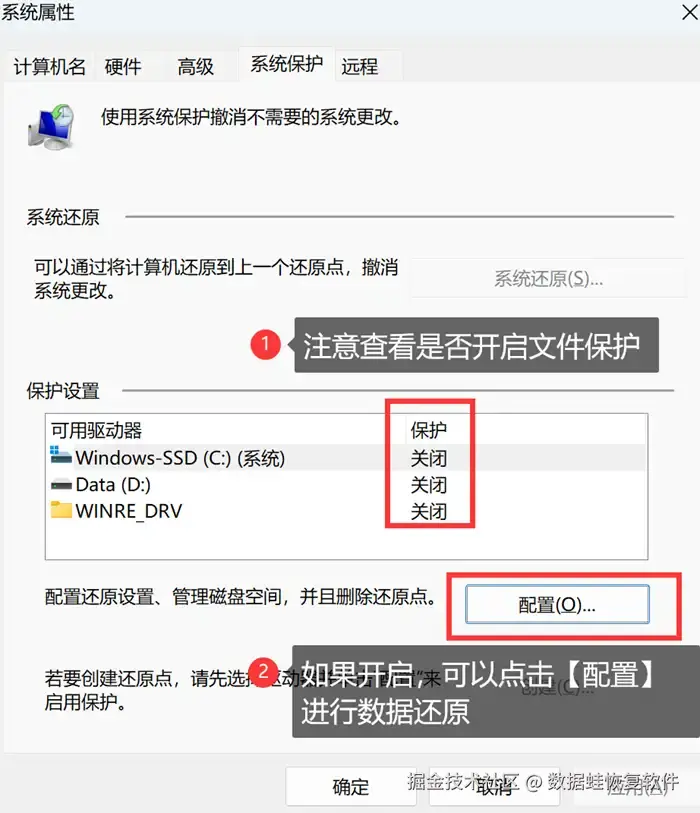 步骤2: 进入系统属性的系统保护页面,可以在【保护设置】上清晰地了解到系统是否开启文件保护,如果开启了的话,可以直接配置还原点,把电脑还原到文件数据丢失之前的状态,就能够做到Windows误删文件恢复啦。是不是很简单?