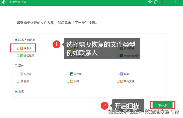 步骤2:确认连接稳定后,选择需要恢复的数据类型,例如 【联系人】 。接下来就可以开启扫描啦!