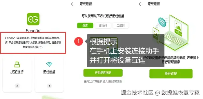 步骤1:首先,我们需要在电脑上下载安装软件,然后打开手机,选择合适的方式,将设备互连。