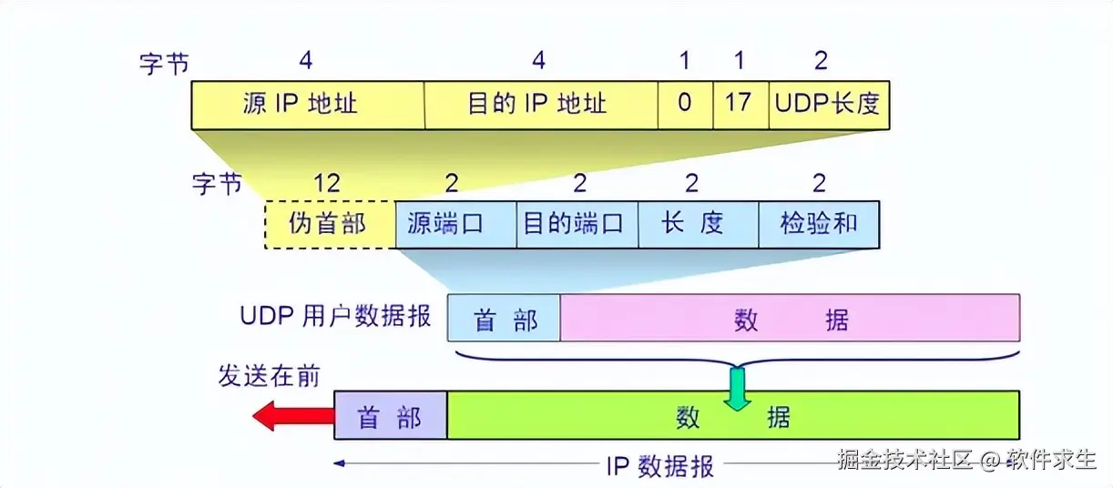 - 检验和(Checksum) : 检验和用于验证UDP报文在传输过程中是否发生了错误。它是一个16位的字段,通过UDP头部、数据部分以及伪首部进行计算。伪首部包括源IP地址、目的IP地址、协议号(17表示UDP)和UDP报文长度。