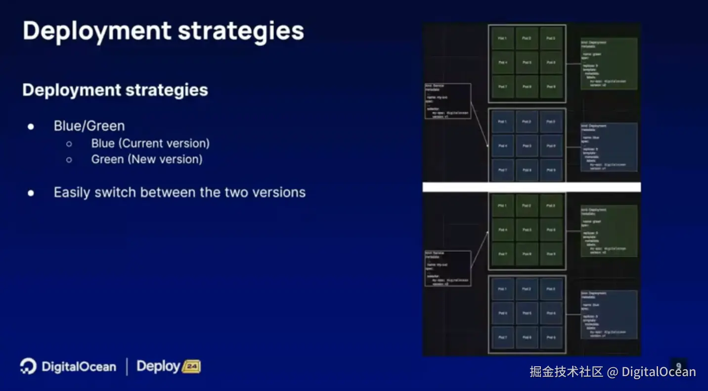 另一个可以轻松通过 DigitalOcean Kubernetes实现的部署就是蓝绿部署。蓝绿部署是一种并行的部署策略,它通过分离的两个部署来引入新版本。这种方法允许在不中断现有服务的情况下,逐步切换到新版本。
