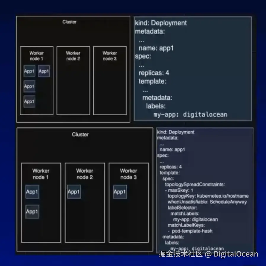 如果我们以一个包含三个工作节点的 DigitalOcean Kubernetes 集群为例,该集群运行着一个具有四个副本的部署。我们希望避免上图右上方所示的情形,即节点 1 成为单一 Pod的单一故障点。如果发生回收事件、集群升级导致节点 1 被清空,或节点 1 上发生的任何其他问题,Kubernetes 重新调度 Pod 到另一工作节点所需的时间可能会导致应用停机和可靠性问题。下图右方通过在部署描述中使用拓扑分布约束解决了这些问题。这样我们就可以将Pod分散到多个工作节点上,从而降低了来自节点1的单一故障点的风险。