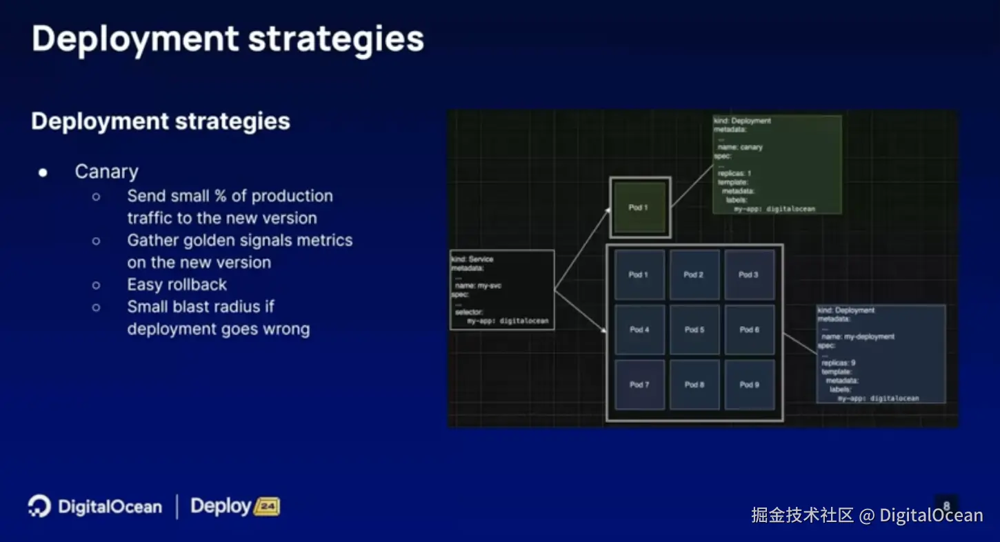金丝雀部署是一种渐进式的部署方法,它首先推出少量带有新版本的副本,并监控其在生产流量下的表现。这种方法的关键在于逐步验证新版本的行为,确保其稳定性和性能。