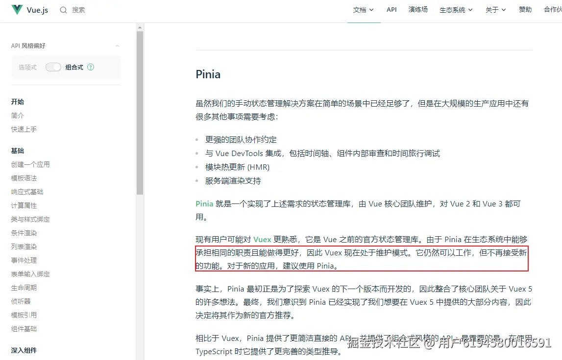由于 Pinia 在生态系统中能够承担相同的职责且能做得更好,因此 Vuex 现在处于维护模式。它仍然可以工作,但不再接受新的功能。对于新的应用,建议使用 Pinia。