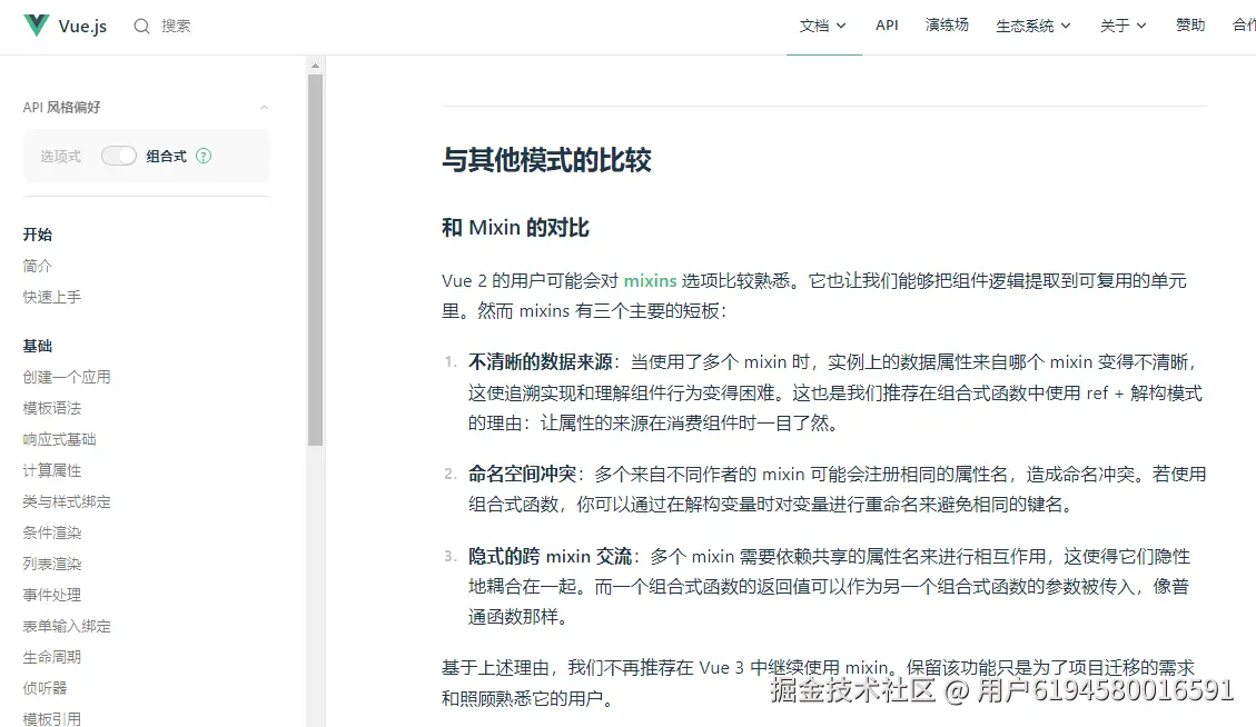 - 隐式的跨 mixin 交流:多个 mixin 需要依赖共享的属性名来进行相互作用,这使得它们隐性地耦合在一起。而一个组合式函数的返回值可以作为另一个组合式函数的参数被传入,像普通函数那样。