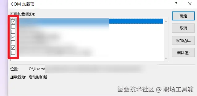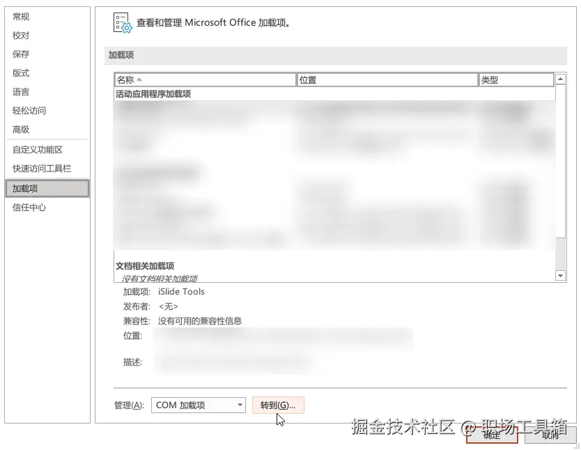 点击下方的「转到」按钮,进入 COM 加载项管理面板。