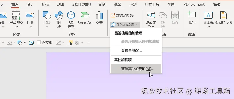 点击「插入 > 我的加载项」,选择「管理其他加载项」,打开 PPT 选项面板。