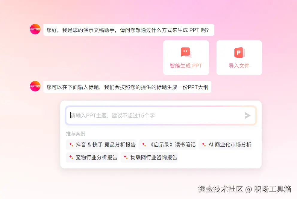 考虑到有些朋友是第一接触在线类的 PPT 软件,这里就以博思 AIPPT 为例,简要介绍其用法: