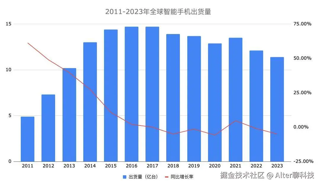 尽管不同调研机构的口径有所不同,但普遍认为智能手机的出货量“巅峰”发生在2017年前后,之后市场开始进入下行周期。因为5G等新技术的应用,全球智能手机出货量在曾2021年短暂复苏,却未能持续太长时间。根据Canalys的统计报告,2023年全球智能手机出货量为11.4亿部,同比下滑4%,创造了10年以来的销量新低。