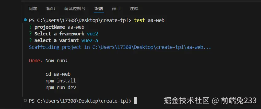 大家如果使用过 create-vite 都知道完成的提示是比较精美使用的,这里用我已经完成的脚手架类似的输出: