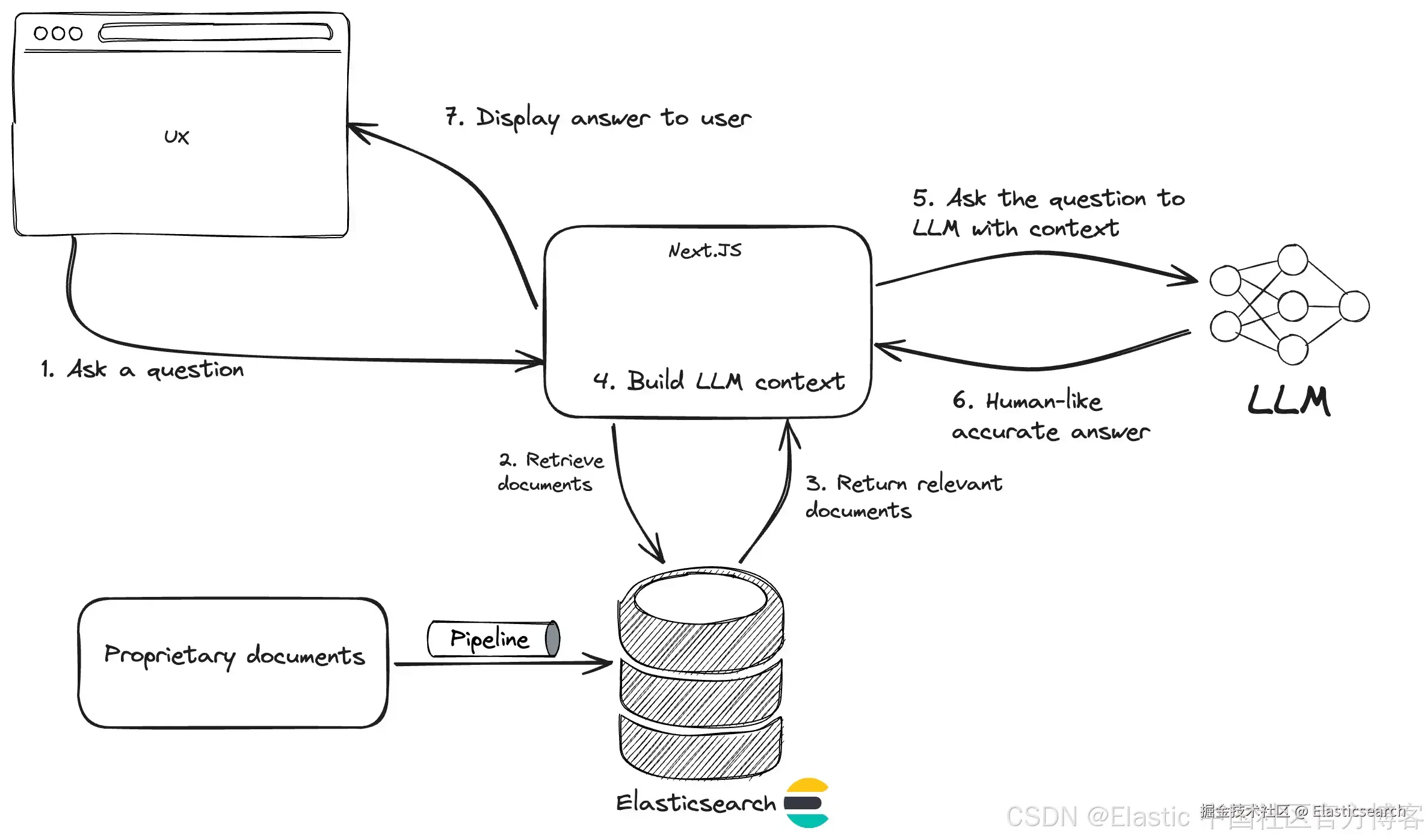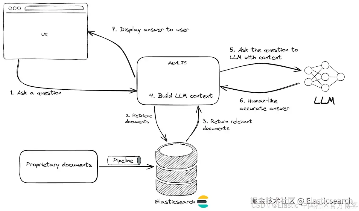 从高级架构的角度来看,AI 对话式搜索体验的核心是 RAG 应用程序,它具有先进的检索系统(在我们的例子中是 Elasticsearch)和对话式界面。
