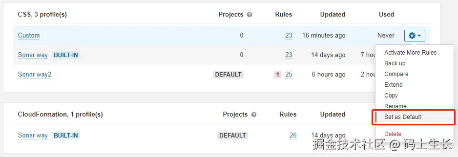 CustomVueCSS配置文件旁的Actions列中,点击Set as Default按钮,将其设置为默认的质量配置文件。