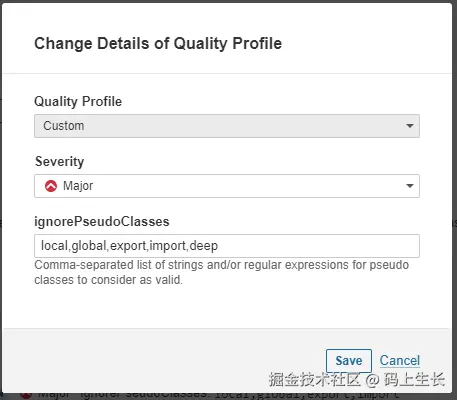 deep作为要忽略的伪类选择器。这样,SonarQube在检查CSS代码时将不再报告deep选择器为无效或错误。 - 点击Save按钮保存更改。